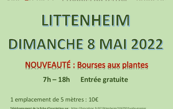 Inscription : https://brocabrac.fr/67/littenheim/1067920-vide-grenier Conseil de fabrique Vide-greniers à Littenheim 2022